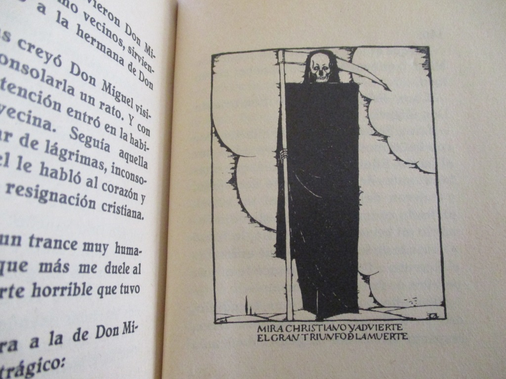 Me veo de niño mirando fascinado y atemorizado también, ese dibujo que ilustra el capítulo final de El coqueto don Sancho Sánchez (1938), libro del que he hablado mucho, sin saber ni quién era el autor del librico, Gabriel de Biurrun Garmendia (un amigo del abuelo boticario) ni el de las ilustraciones, el escritor falangista Ángel María Pascual, primo de mi tío abuelo Jesús Ayala (La nave de Baco)… runrunes de calaveras, diría Ramón Rocha Monroy… El esqueleto, la muerte, la huesera del cementerio del pueblo a la que se cayó el otro abuelo un día que fuimos a visitar la tumba del tío Bernabé y estaba la puerta cerrada, el viejo panteón familiar que me espantaba, las llaves de las momias… al final escribo de ella, de la que no tiene nombre, o por su causa, en estos amenes de un mundo que ha cantado con garbo un ítem…