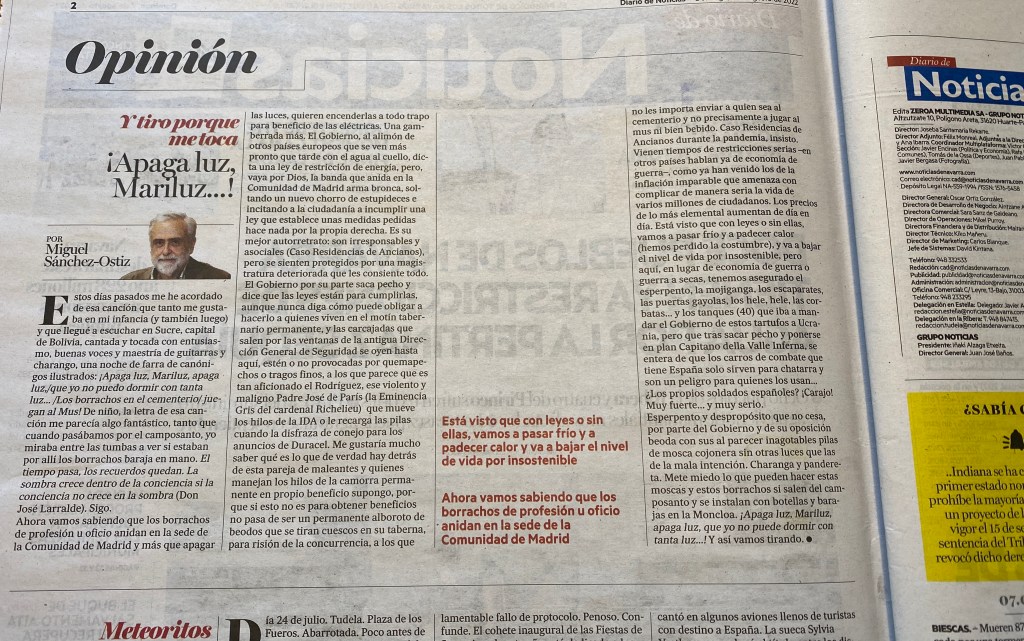 Estos días pasados me he acordado de esa canción que tanto me gustaba en mi infancia (y también luego). La llegué a escuchar en Sucre, capital de Bolivia, cantada y tocada con entusiasmo, buenas voces y maestría de guitarras y charango, una noche de farra de canónigos ilustrados: ¡Apaga luz, Mariluz, apaga luz,/que yo no puedo dormir con tanta luz… /Los borrachos en el cementerio/ jue-gán al Mus! De niño, la letra de esa canción me parecía algo fantástico, tanto que cuando pasábamos por el camposanto, yo miraba entre las tumbas a ver si estaban por allí los borrachos baraja en mano. El tiempo pasa, los recuerdos quedan. La sombra crece dentro de la conciencia si la conciencia no crece en la sombra (Don José Larralde). Sigo.