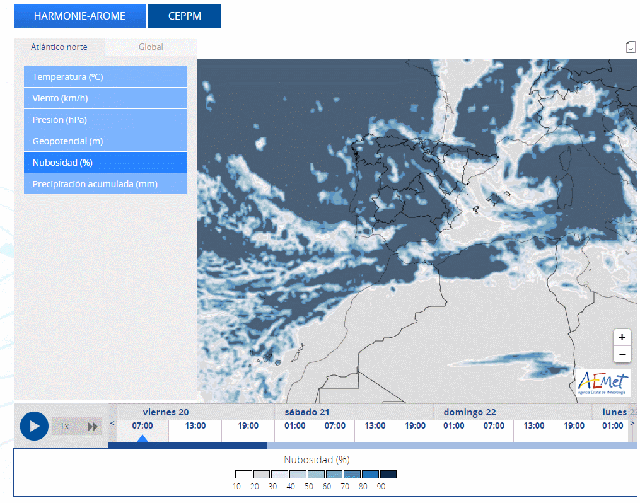El viernes y el sábado habrá un predominio de los cielos nubosos en el cuadrante noroeste, con precipitaciones en general débiles en la mitad norte. No se descartan ocasionales en el resto, más probables en zonas montañosas. El domingo los cielos estarán poco nubosos o despejados, con algunos intervalos nubosos y baja probabilidad de alguna precipitación débil en Pirineos, Cantábrico oriental y Alborán. En Baleares habrá intervalos nubosos y chubascos ocasionalmente acompañados de tormenta. Las cotas de nieve se situarán por debajo de los 500 m en Baleares y nordeste peninsular, y en torno a 1000 m bajando hasta los 500 m en el resto (más altas en el tercio occidental peninsular), si bien, salvo en Pirineos, no se esperan nevadas importantes. (…)