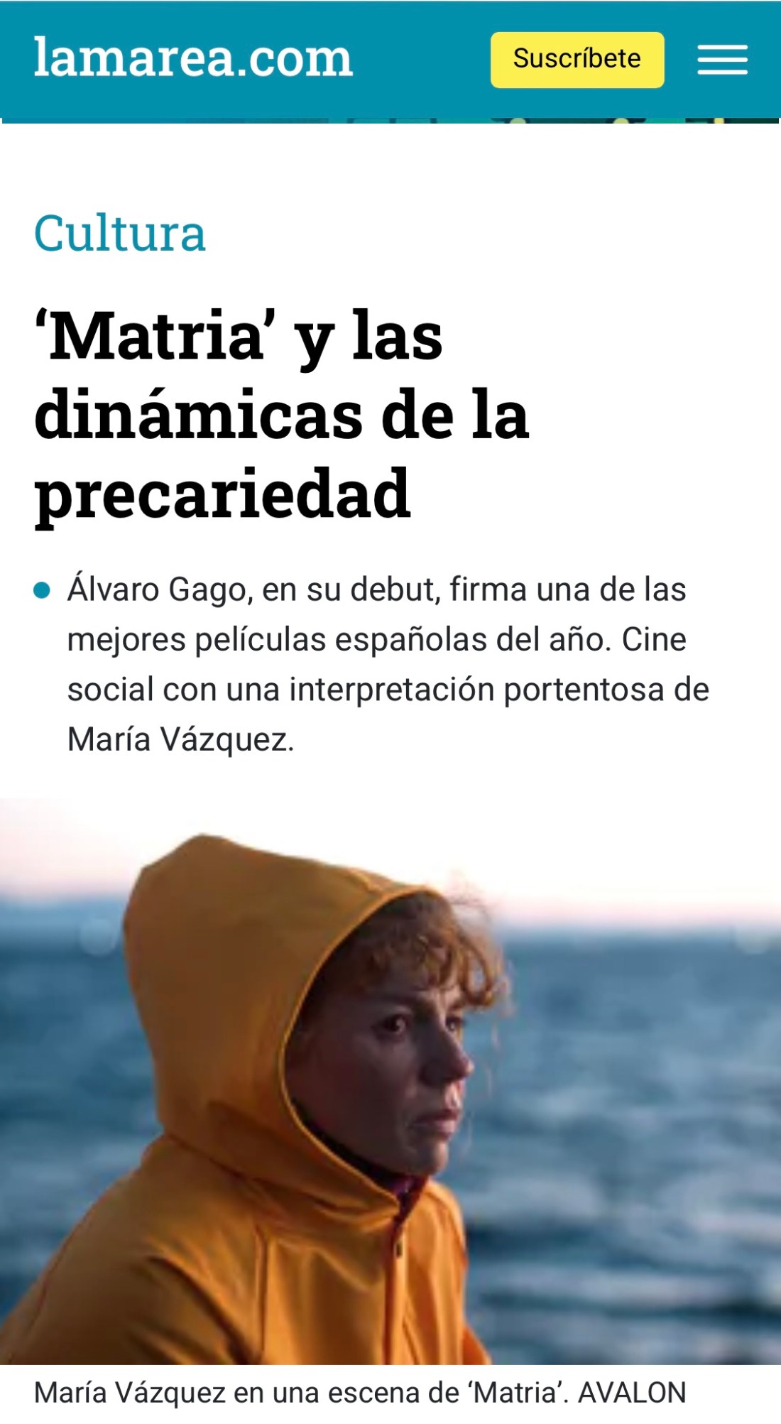 Álvaro Gago titula así, Matria, su debut en el largometraje, basado en un corto anteriorpremiado en Sundance y nominado al Goya. Cuenta la historia de Ramona, una mujer temperamental que se multiplica en varios trabajos para sobrevivir y para ahorrar un poco con lo que contribuir a que el futuro de su hija no sea como su vida presente. A través de ella, Gago rinde homenaje a esas mujeres que trabajan de marisqueiras, de limpiadoras, de cuidadoras, de operarias en las fábricas de conservas o, con un despliegue de fuerzas realmente heroico, en todo eso a la vez. El suyo es un heroísmo sin fanfarrias ni medallas ni desfiles. Es otra cosa. Es la matria.