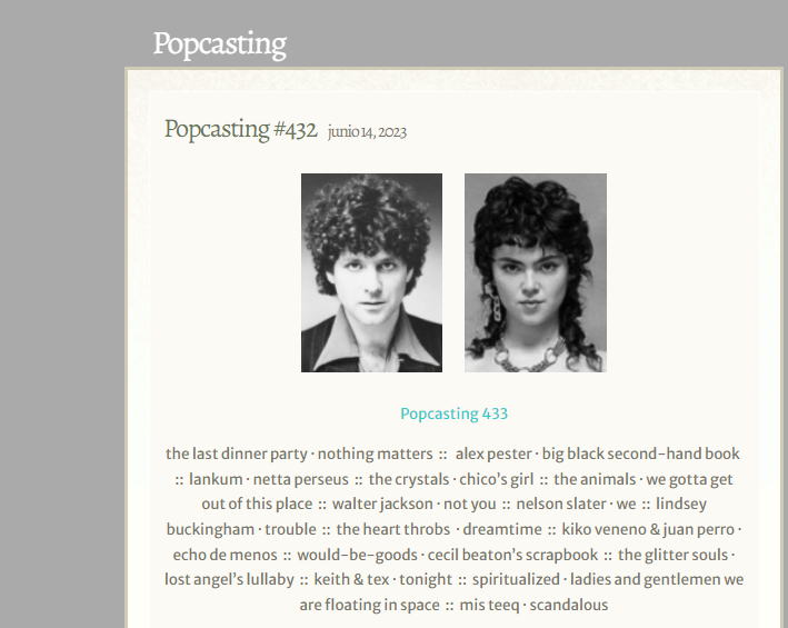 the last dinner party · nothing matters :: alex pester · big black second-hand book :: lankum · netta perseus :: the crystals · chico’s girl :: the animals · we gotta get out of this place :: walter jackson · not you :: nelson slater · we :: lindsey buckingham · trouble :: the heart throbs · dreamtime :: kiko veneno & juan perro · echo de menos :: would-be-goods · cecil beaton’s scrapbook :: the glitter souls · lost angel’s lullaby :: keith & tex · tonight :: spiritualized · ladies and gentlemen we are floating in space :: mis teeq · scandalous