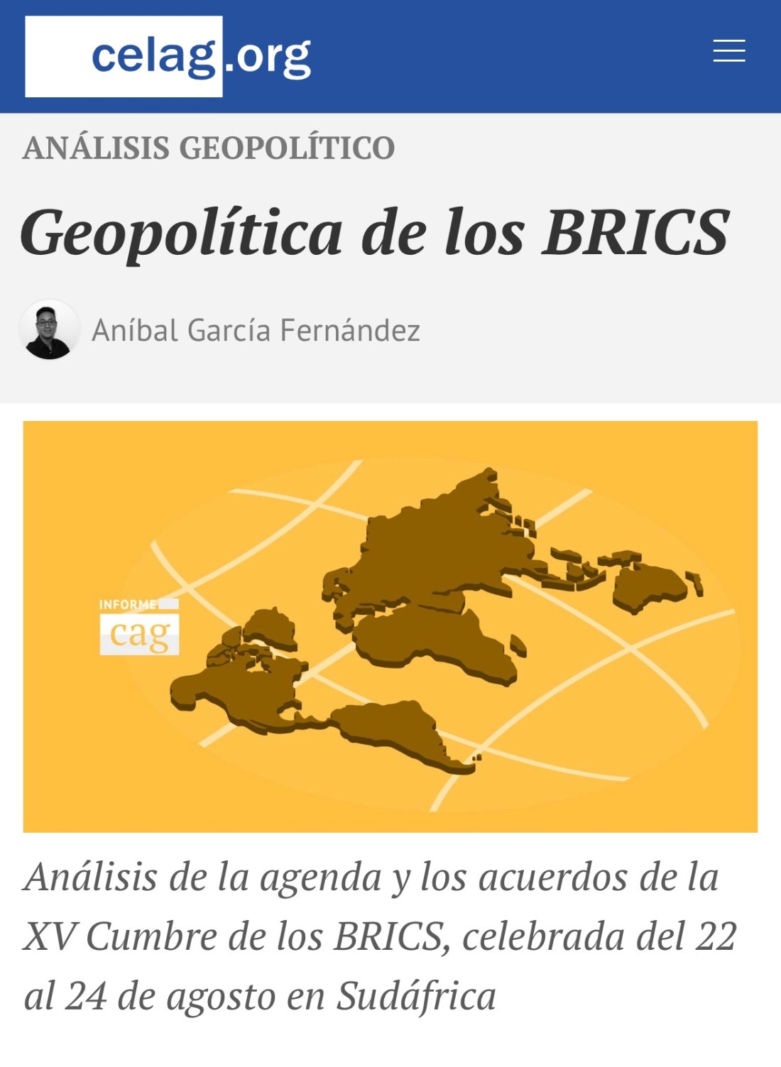 Geopolítica de los BRICS — CELAG CC Sin categoría 24 agosto, 202324 agosto, 2023 1 minuto Geopolítica de los BRICS — CELAG — Leer en www.celag.org/geopolitica-de-los-brics/ Compártelo: Comparte en Facebook (Se abre en una ventana nueva) Facebook Compartir en Telegram (Se abre en una ventana nueva) Telegram Compartir en Bluesky (Se abre en una ventana nueva) Bluesky Compartir en X (Se abre en una ventana nueva) X Más Compartir en X (Se abre en una ventana nueva) X Compartir en WhatsApp (Se abre en una ventana nueva) WhatsApp Compartir en LinkedIn (Se abre en una ventana nueva) LinkedIn Me gusta Cargando... Publicado 24 agosto, 202324 agosto, 2023