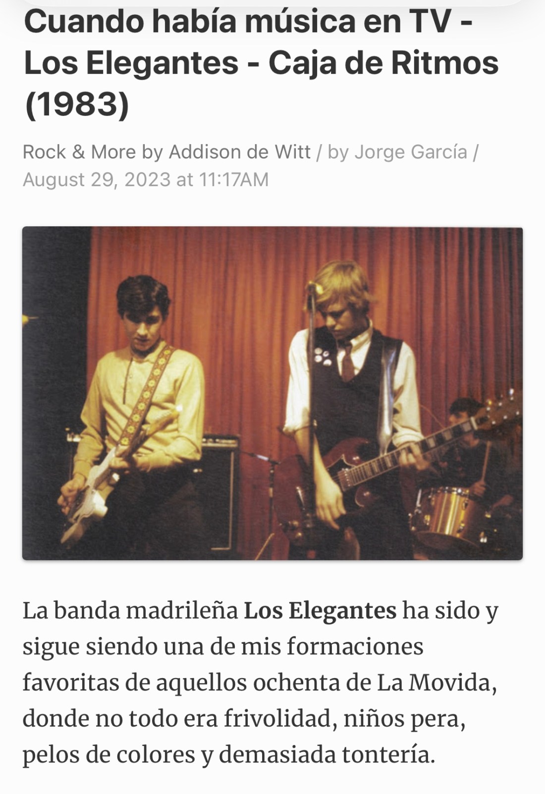 Cuando había música en TV – Los Elegantes – Caja de Ritmos (1983) CC Sin categoría 29 agosto, 202329 agosto, 2023 1 minuto www.rockampmorebyaddisondewitt.com/2023/08/cuando-habia-musica-en-tv-los-elegantes.html Compártelo: Comparte en Facebook (Se abre en una ventana nueva) Facebook Compartir en Telegram (Se abre en una ventana nueva) Telegram Compartir en Bluesky (Se abre en una ventana nueva) Bluesky Compartir en X (Se abre en una ventana nueva) X Más Compartir en X (Se abre en una ventana nueva) X Compartir en WhatsApp (Se abre en una ventana nueva) WhatsApp Compartir en LinkedIn (Se abre en una ventana nueva) LinkedIn Me gusta Cargando... Publicado 29 agosto, 202329 agosto, 2023